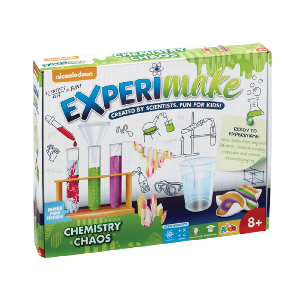 Introduce your little scientists to the wonders of chemistry with the Nickelodeon Experimake Chemistry Chaos Set! Packed with fun, hands-on experiments like growing stalagmites and stalactites, exploring chromatography, and creating a lava lamp effect, this kit makes learning about science exciting and interactive. Designed by scientists for children aged 8 and up, it encourages curiosity, problem-solving, and fine motor skill development while providing hours of engaging STEM play.