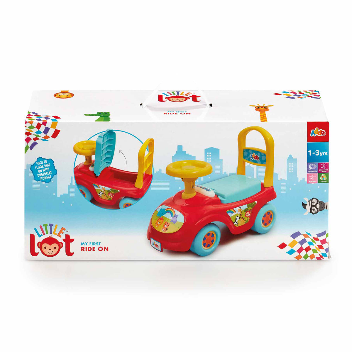 Get ready for endless adventures with the Little Lot My First Ride On! Perfect for little explorers, this bright red and blue ride-on vehicle encourages active play indoors or outdoors. Children can scoot around using their feet or enjoy being pushed along by a grown-up using the sturdy handle. With a working horn, steering wheel, and friendly animal stickers, every ride becomes a fun-filled journey of imagination and discovery.