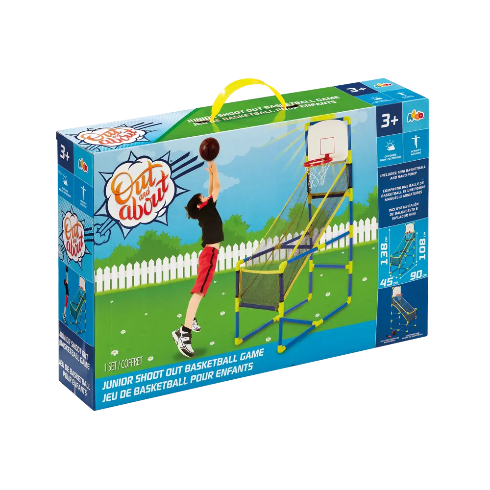 Get ready for action-packed fun with the Out and About Junior Shoot Out Basketball Game! Designed for young athletes aged 3 and up, this vibrant mini basketball set encourages hours of indoor and outdoor play. The set includes a basketball hoop, backboard, net, mini basketball, and a hand pump, providing everything children need to start practicing their shooting skills immediately. Perfect for developing hand-eye coordination, motor skills, balance, and focus, this sturdy basketball game inspires active play, teamwork, and sportsmanship. Its durable, child-friendly design ensures long-lasting entertainment for growing basketball enthusiasts.