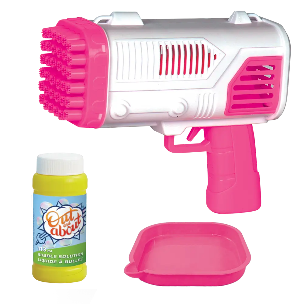 Turn outdoor play into a bubble-filled adventure with the Out and About Xtreme Bubble Blaster! Designed in a bright pink colour with a chunky grip for little hands, this exciting toy blasts hundreds of bubbles in seconds for endless fun. Simply pour the included bubble solution into the tray, dip the nozzle, and enjoy five seconds of bubble-blasting excitement. With 36 bubble holes, children can create a spectacular stream of bubbles that encourages active outdoor play, imagination, and hand-eye coordination. Compact and battery-operated, this blaster is perfect for garden play, parties, and family fun.