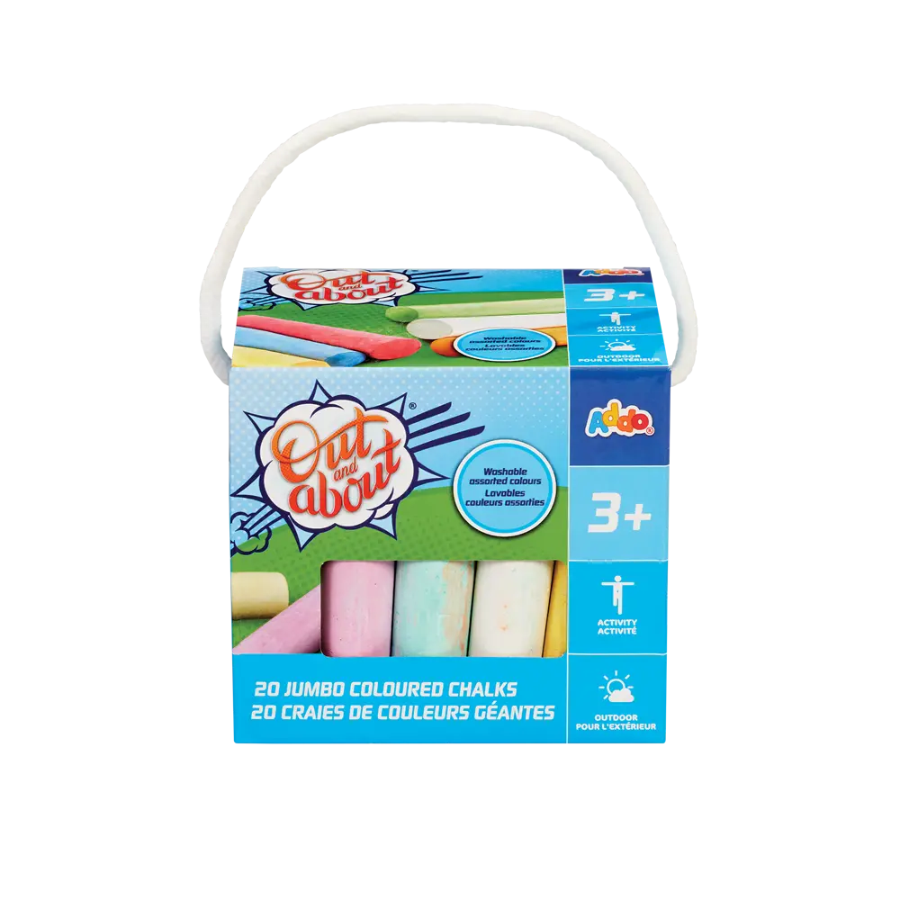 Unleash creativity outdoors with the Addo Out and About Jumbo Chalks V2! Perfectly designed for little hands, these vibrant, chunky chalks make drawing on sidewalks, driveways, and playgrounds fun and easy. Each pack includes 20 jumbo-sized chalks in bright, eye-catching colors, including pink, purple, blue, green, and yellow. The extra-large size encourages fine motor skill development while letting children create colorful masterpieces, from hopscotch games to imaginative murals. Washable and made from non-toxic materials, these chalks are safe, reusable, and ideal for endless outdoor fun for children aged 3 and up.