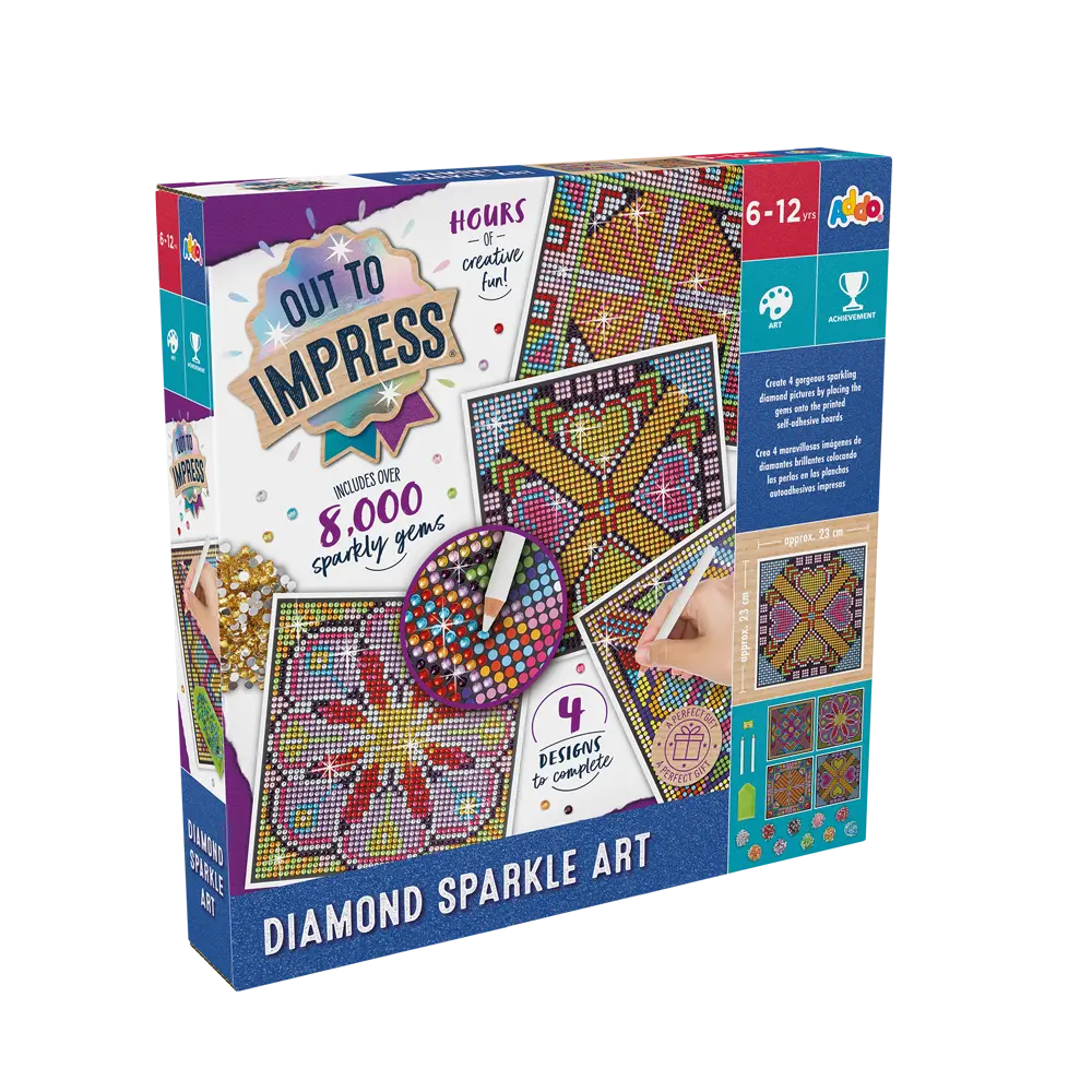 Add sparkle to every creation with the Diamond Sparkle Art set from Out To Impress! This glittering craft kit lets kids create dazzling masterpieces by placing colourful gems onto self-adhesive design sheets—no glue needed. Using the included wax-tipped pen, simply pick up a gem and place it on the matching coloured dot to watch your artwork come to life. With over 8,000 gems, four design sheets, and all the tools included, children can enjoy hours of relaxing, creative fun. Perfect for decorating rooms, gifting to friends, or showcasing as glittery works of art. Awarded Bronze in the Arts and Crafts category by the Right Start Awards, this set inspires creativity and imagination.