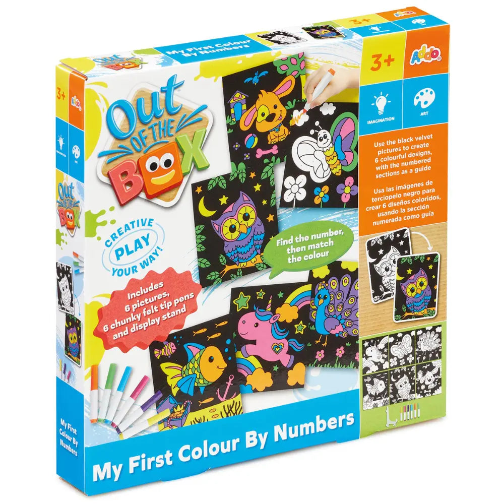 Inspire creativity and learning with the Out of the Box My First Color By Numbers Craft Set! Perfect for little artists aged 3 and above, this mess-free activity set lets children bring six black velvet pictures to life using the included chunky felt tip pens. They can follow the colour-by-numbers guide for neat results or unleash their imagination to create unique designs. Once complete, each masterpiece can be proudly displayed on the handy included stand, making it an engaging and rewarding craft experience.