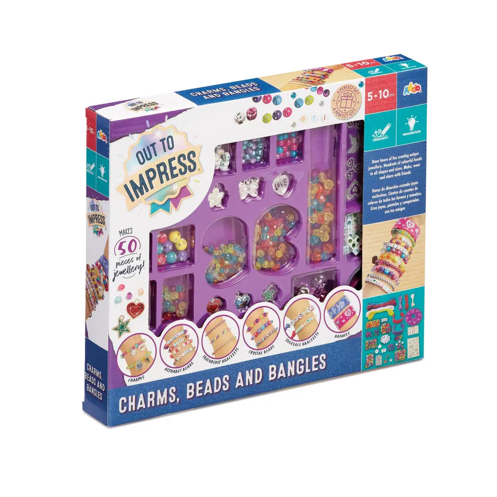 Unleash creativity and fashion flair with the Out to Impress Charms, Beads and Bangles craft set! Perfect for young jewellery designers, this set allows children to create up to 50 unique pieces, including charms, bracelets, friendship bands, and bangles. Featuring a wide assortment of colourful beads, charms, threads, elastic, and a bracelet wheel, kids can mix and match to design personalised jewellery for themselves, friends, or family. Ideal for hours of hands-on fun, this kit encourages fine motor skills, creativity, and imaginative play, making it perfect for budding fashionistas.