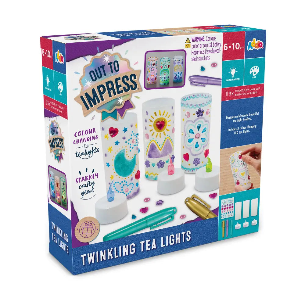 Spark creativity and add a magical glow with the Out to Impress Twinkling Tea Lights! This craft set lets children personalise their own LED tea light holders using metallic pens, gems, jewels, and glitter glue. Kids can create enchanting designs featuring flowers, stars, butterflies, or any pattern their imagination inspires. Once decorated, the flickering LED tea lights create a cozy, realistic glow without any open flame, making it safe for little ones. Perfect for hands-on crafting, self-expression, and gifting, these twinkling tea lights offer endless creative fun.