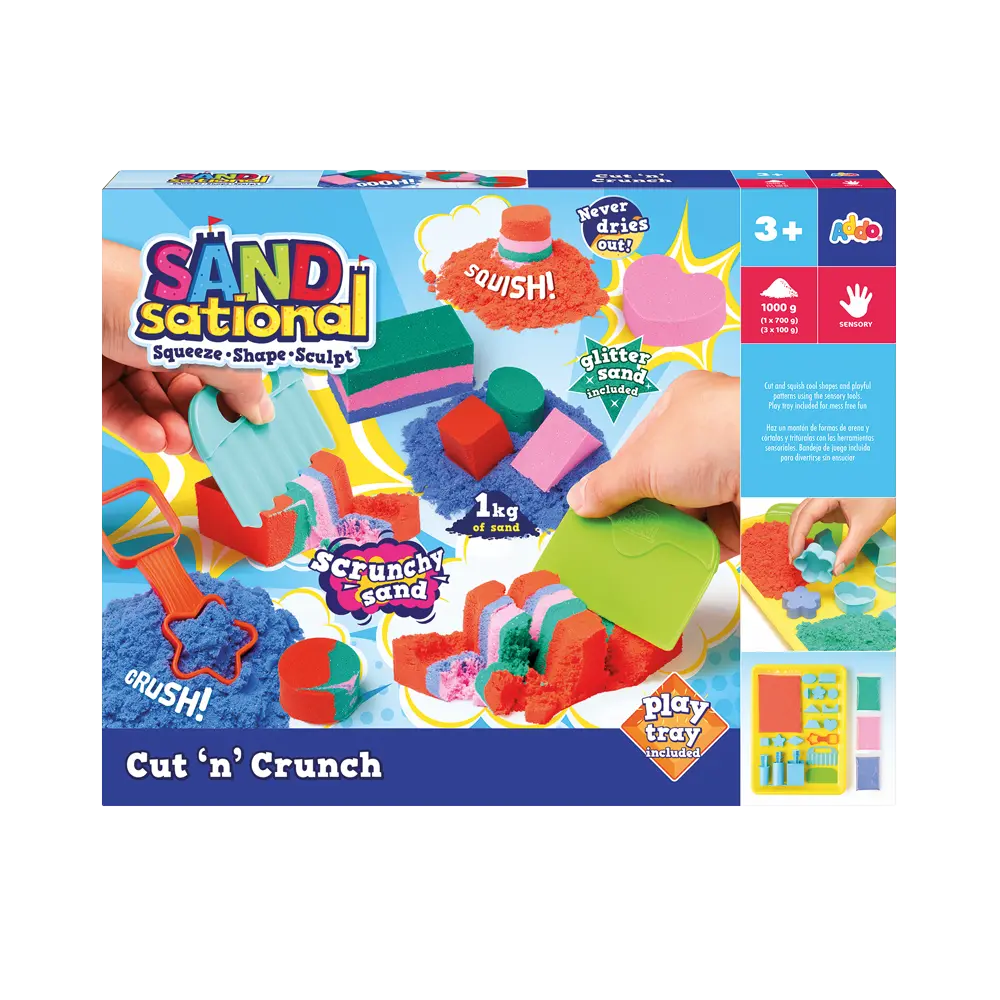 Squeeze, shape, and sculpt for hours of creative, sensory fun with SANDsational Cut ‘n Crunch! This vibrant playset invites kids on a colorful adventure filled with endless shaping and slicing possibilities. With 600 grams of sand in 6 bold colors, plus 13 moulds and 3 modeling tools, children can layer, cut, and crunch their creations over and over again. The included play tray keeps playtime tidy and stress-free — perfect for mess-free magic!