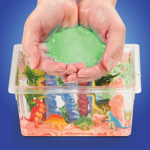 Dive into prehistoric fun with the SANDsational Splash Dinosaur Set! Kids can squeeze, sculpt and scoop to create their very own underwater Jurassic world. Simply fill the squeezy bottle with colourful sand, flip it into the water and watch as amazing underwater sand sculptures form like magic. Scoop them out to reveal dry sand every time—ready to reshape, rebuild and play again. With a scenic background and fun accessories included, little dino fans can bring their creative world to life. When playtime is over, the resealable bag keeps everything tidy and ready for next time.