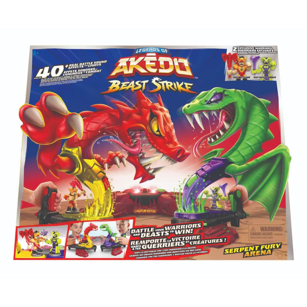 Unleash the ultimate battles with the Akedo Beast Strike Serpent Fury Arena! Designed for thrilling action, this arena brings 3 epic ways to fight, letting players create endless combat scenarios. Switch between characters using the arena’s Battle Trigger Controllers for dynamic matchups, pit beasts against beasts, or go head-to-head with warrior vs. warrior showdowns.