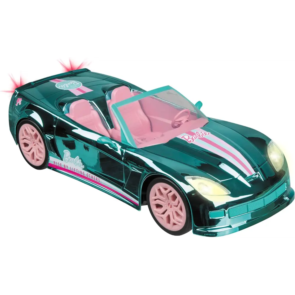 Barbie can now travel in style with the Barbie Convertible Dream Car, designed to fit any Barbie doll (sold separately). This 2.4 GHz radio-controlled car offers full movement—forward, reverse, left, and right—with working front and rear lights. Measuring 40 cm long, it features pink alloy wheels and a sleek Tiffany green finish, making it the perfect ride for Barbie’s 65th Anniversary celebration. With a top speed of 8 km/h, this hard-bodied dream car combines fun and style.