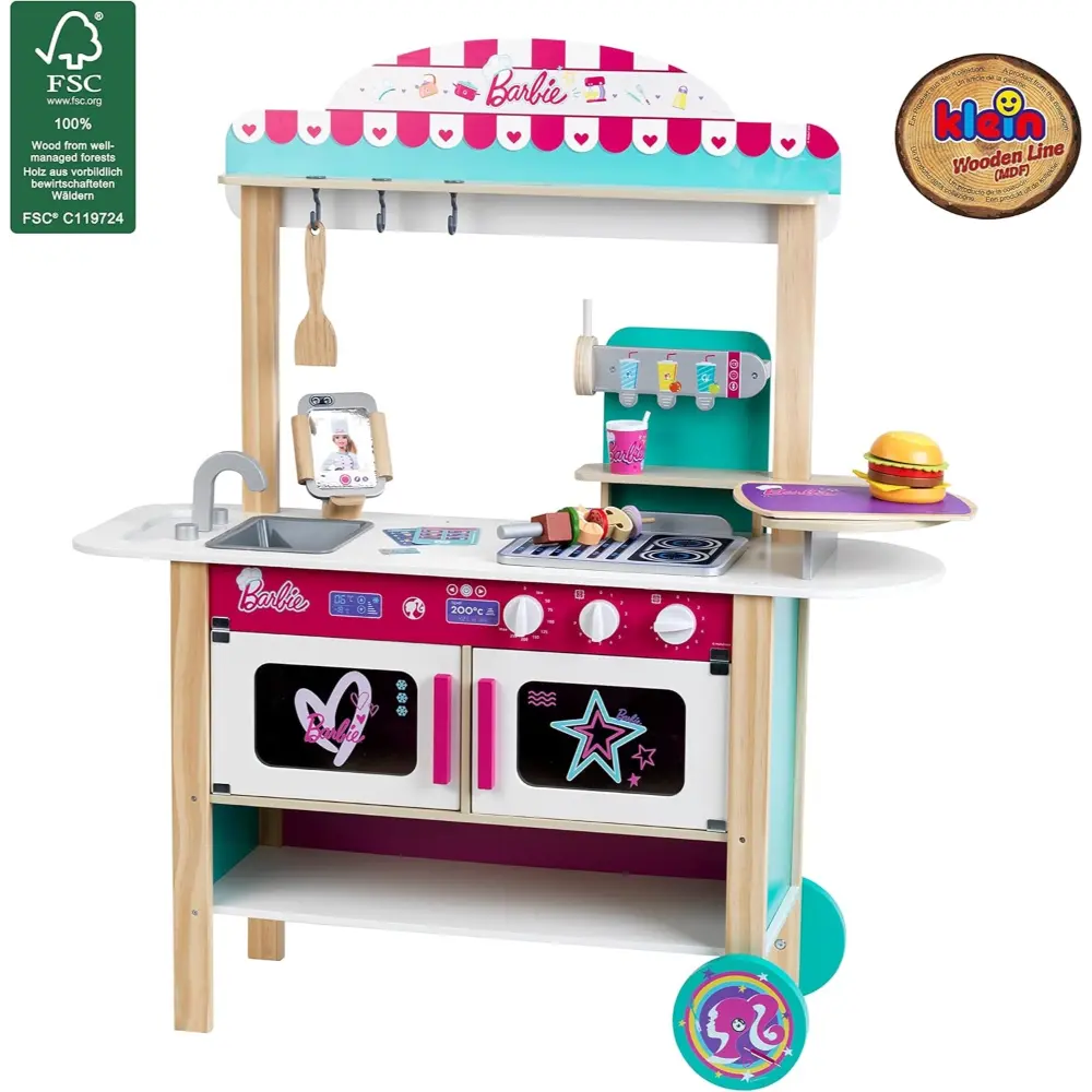 The Barbie BBQ Bistro Playset is perfect for kids who love pretend cooking and imaginative storytelling! This playset includes an oven, barbecue grill, fridge, and drink dispenser, along with mix-and-match food pieces like burgers and kebabs. Accessories such as a tray, cup, spatula, tablet, and pretend credit card let little chefs run their own bistro. Ideal for children aged 3 and up, this set encourages creativity, communication, and fine motor skills.