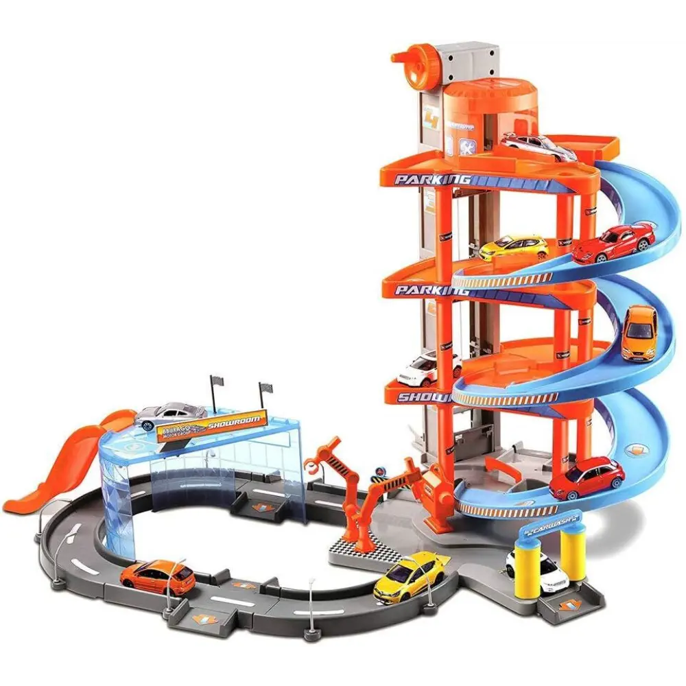 Take car play to the next level with the four-story Bburago Mega Dealer Showroom! Designed for 1:43 scale cars, this interactive playset features a lift to hoist cars between floors and a twisting ramp for smooth roll-down action. The ground floor includes a car wash, a small road network, and a clear plastic showroom with roof access ramp for added fun. The set comes complete with two 1:43 scale cars from the Street Fire range.