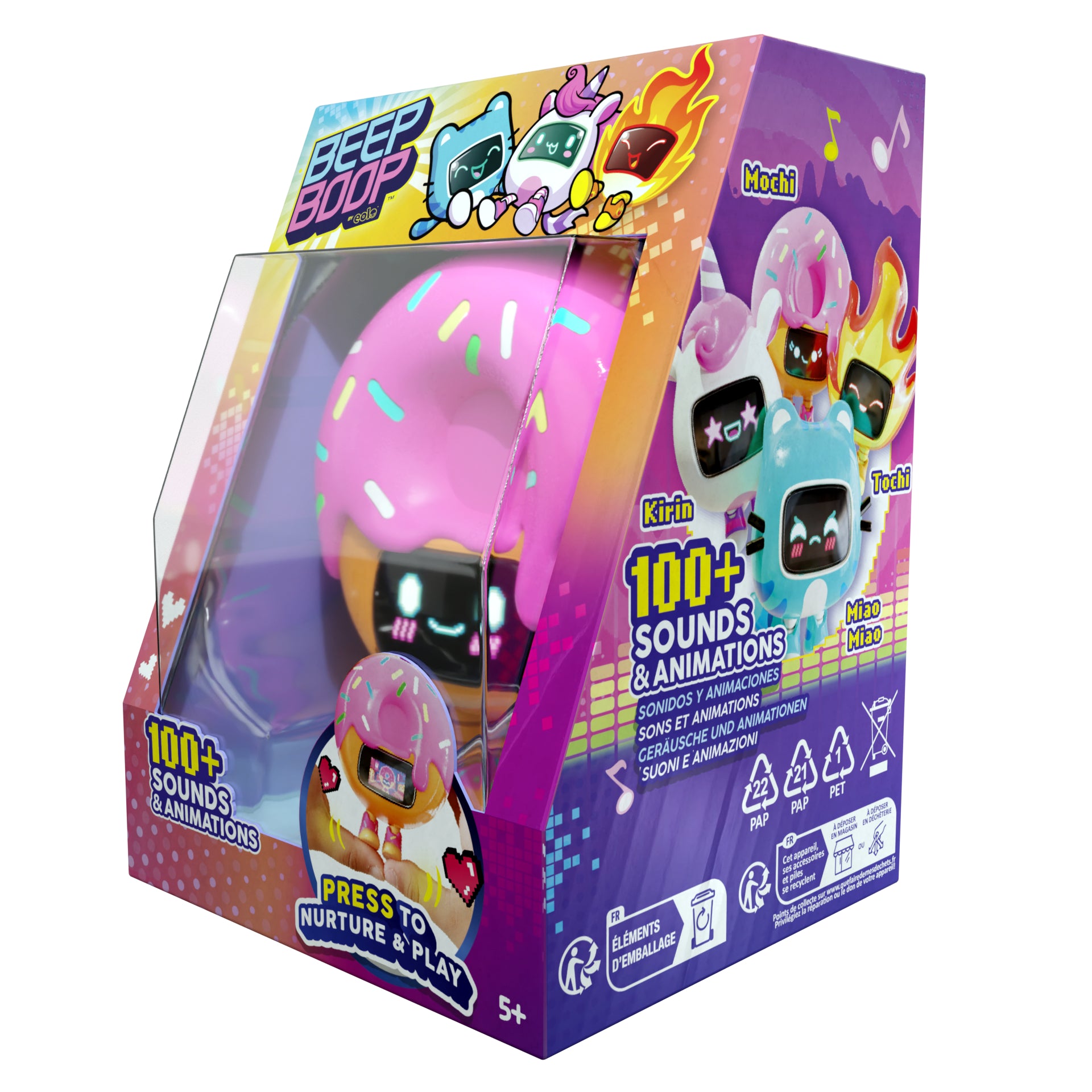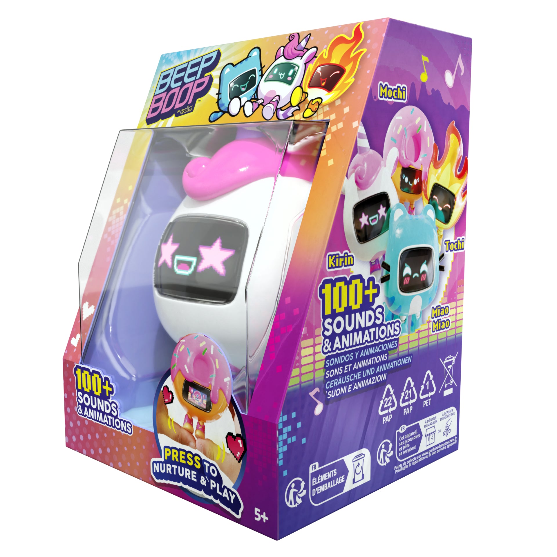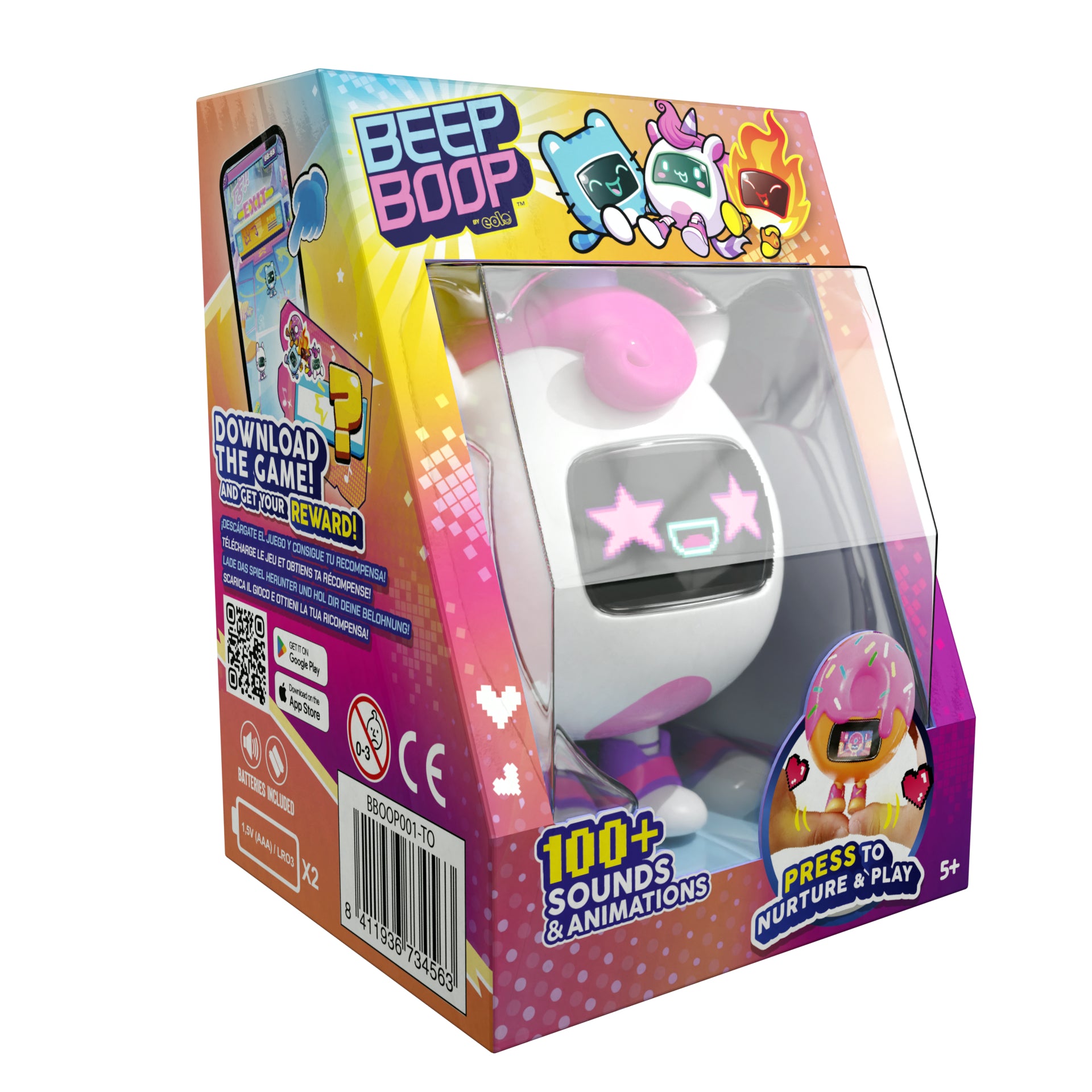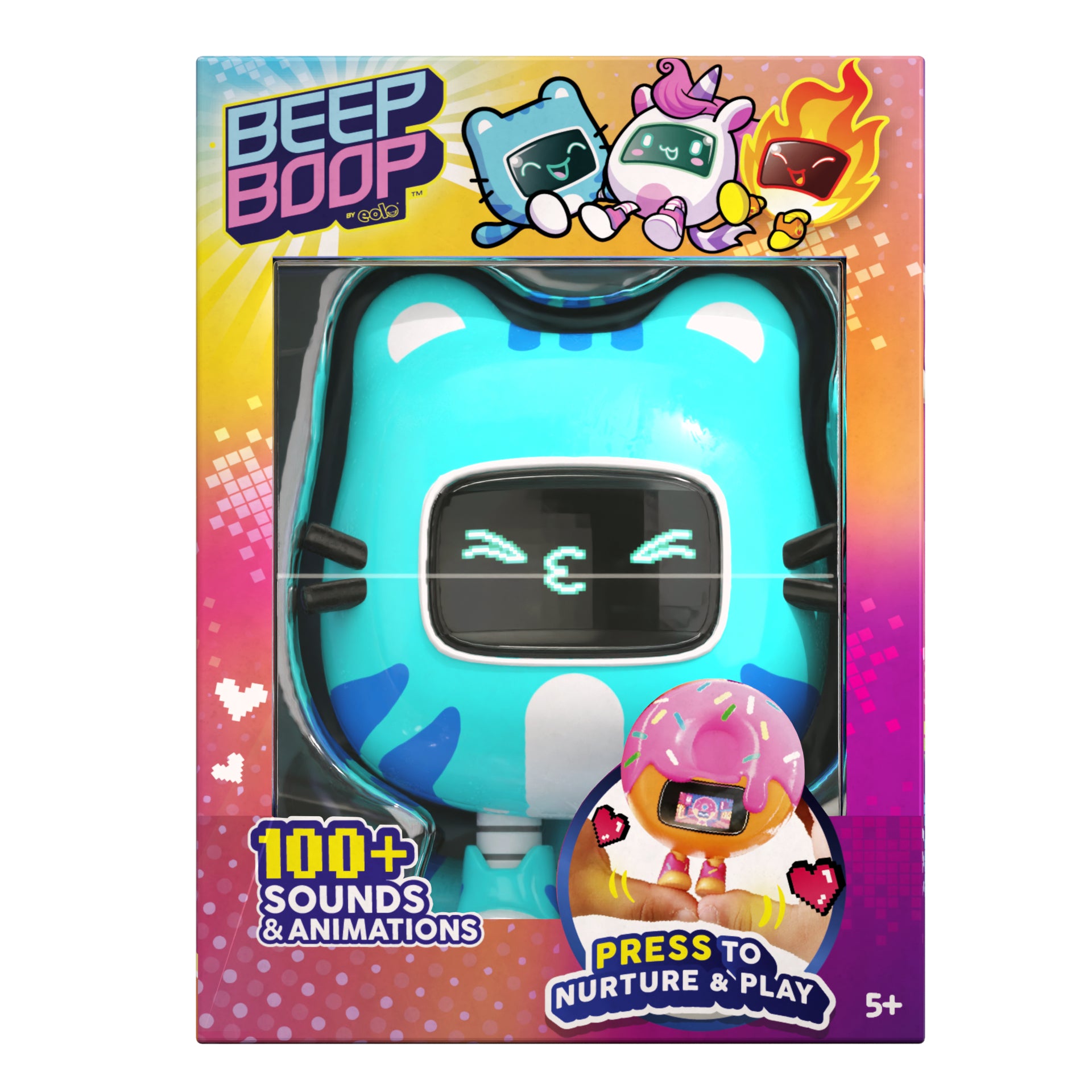Meet your new pocket-sized pals with the Beepboop Interactive Pet Figures (4 Assortment)! Each pet comes alive with fun sounds, LED facial expressions, and playful reactions. Kids can feed, cuddle, and interact with their pets to unlock exciting responses, promoting imaginative play and nurturing skills. With four unique characters to collect—Flame, Donut, Kitty, and Unicorn—there’s plenty of fun for everyone. Compact and portable, these pets are perfect for play at home or on the go. Suitable for children aged 5 years and above.