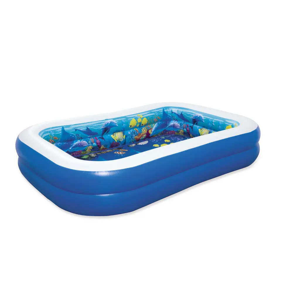 Designed to get kids moving, grooving and out of the house, the 3D Underseaï؟½ Play Adventure Pool is quality-tested and puts the focus back on fun! With 2 equal rings, 2 interconnecting nozzles and extra wide side walls, this is the perfect pool for kids. The pool includes 2 sets of 3D goggles and a handful of crystal treasure so kids can go on their own treasure hunt in their own backyard. When you are done with the pool, the water easily releases with the easy-to-use drain The pool can also be used without water. Playing in the sun has never been more fun than with the 3D Undersea Play Adventure Pool.