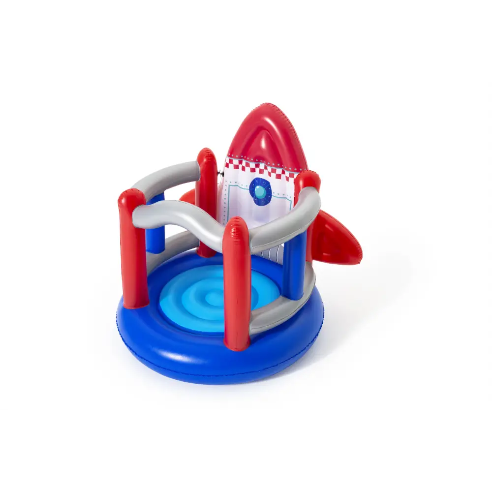 Kids can bounce all the way to the moon with this Up In & Overï؟½ Rocket Bouncer! This bouncer provides a safe, fun place for kids to play and stay active for hours. Itï؟½s the perfect size for kids to jump, both indoors and outdoors. While kids will go crazy for the fun rocket design, parents will love the inflatable guard rails for added safety. Plus, the Rocket Bouncer is fast and easy to set up, while still being lightweight and portable. Let your little astronautï؟½s imagination run wild as they jump and play in the Up In & Over Rocket Bouncer!