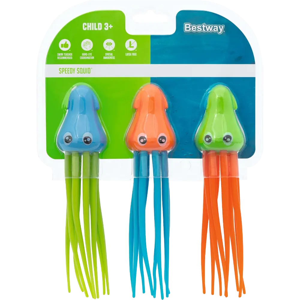 Toss these Hydro-Swim Speedy Squid Dive Toys into the pool and watch as they race down to the bottom! The tentacles wiggle, making the toys look like real swimming squids. Your kids will have a blast chasing after them, trying to collect them all. For an extra challenge, they can try and catch them before they hit the floor. These Speedy Squid come recommended by swim lesson instructors as they build confidence and coordination in the water. Plus, the bright colors make them easy to spot and grab. These dive toys are great for the pool, and they are also great toys to play with during bathtime! Encourage your child’s imagination with the Hydro-Swim Speedy Squid Dive Toys!