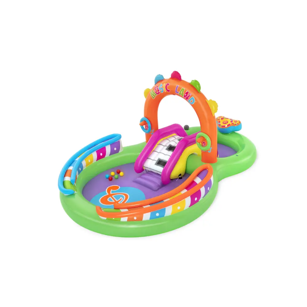 ROCK OUT THIS SUMMER WITH THE BESTWAY SING N SPLASH PLAY CENTER! KIDS CAN EXPLORE THEIR MUSICAL SIDE AND SPLASH IN THE SUN WITH THE EXTENSIVE PLAY FEATURES AND ALL THE INFLATABLE MUSICAL INSTRUMENTS. THIS PLAY CENTER INCLUDES A MICROPHONE AND A DRUM FOR KIDS TO PLAY WITH, INSPIRING THEM TO USE THEIR IMAGINATION. THE DOUBLE POOLS PROVIDE MULTIPLE PLAY AREAS AND ARE CONNECTED BY A REMOVABLE SLIDE. THE POOL FLOOR HAS AN INFLATABLE LANDING CUSHION FOR EXTRA COMFORT WHEN KIDS SLIDE DOWN.