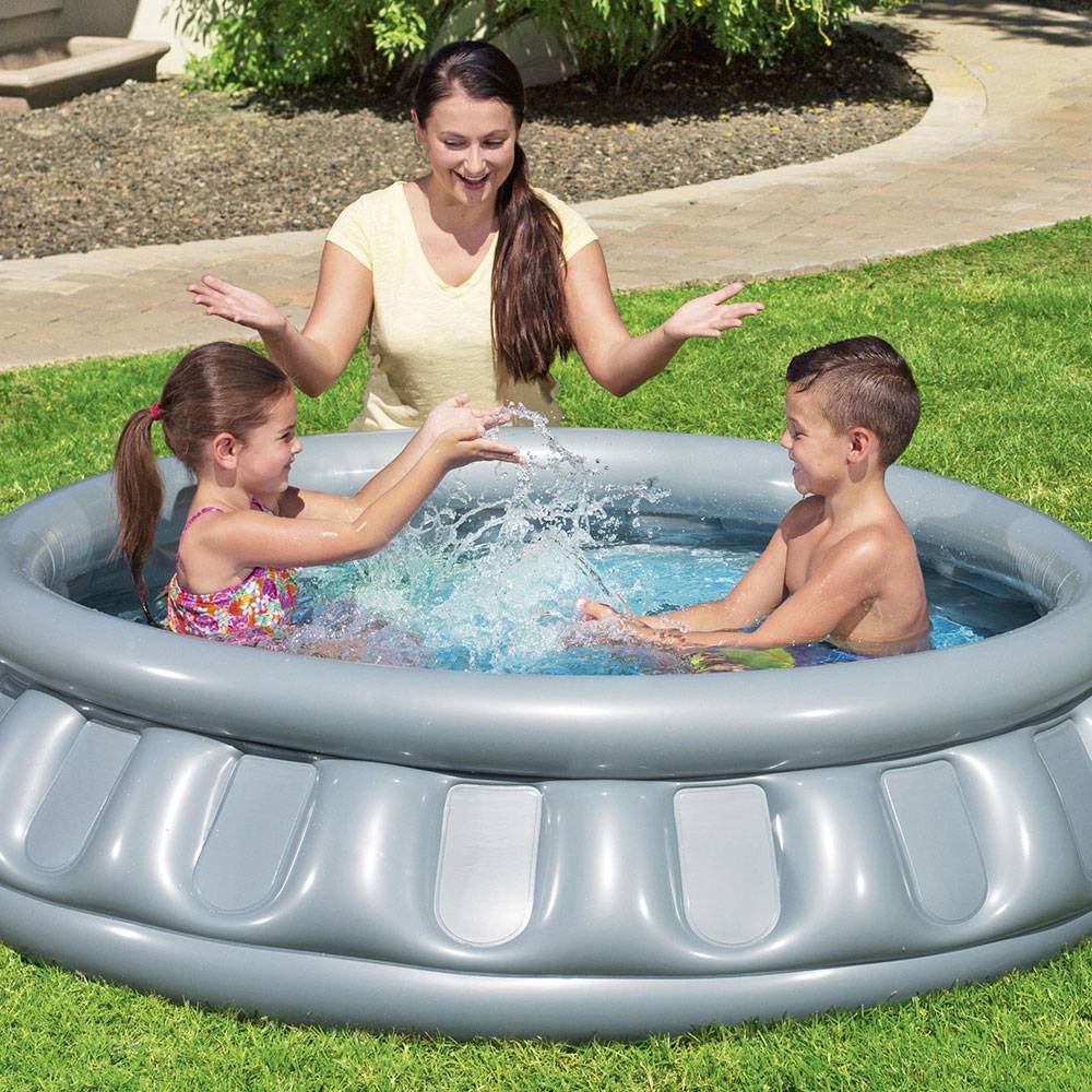 Designed to get kids moving, grooving and out of the house, this Space Ship Pool is quality-tested and puts the focus back on fun! The Spaceship Pool comes in a truly unique design in the shape of a silver flying saucer! The padded exterior liner even resembles the ports and flukes of a 1950's style Hollywood flying saucer film prop! Kids can have an out of this world fun time splashing about in the pool on sunny day with friends. What's more, the pool is easy to set up - simply inflate the 3 air chambers using an air pump and fill with water. Splashing in the sun has never been more fun than with the Space Ship Pool.