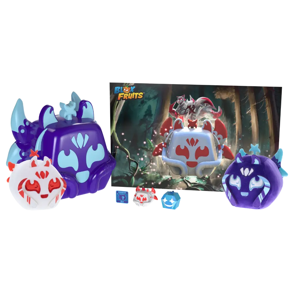 Bring home this mythical beast from the hit Blox Fruits games with the Kitsune Collector Bundle. The reusable storage container open to reveal 11 great items inside! This incredible, instant collection includes a premium DLC code, a Mythical DLC code, an exclusive plush, a mystery plush and more. Remember, with Blox Fruits, you are what you eat!
