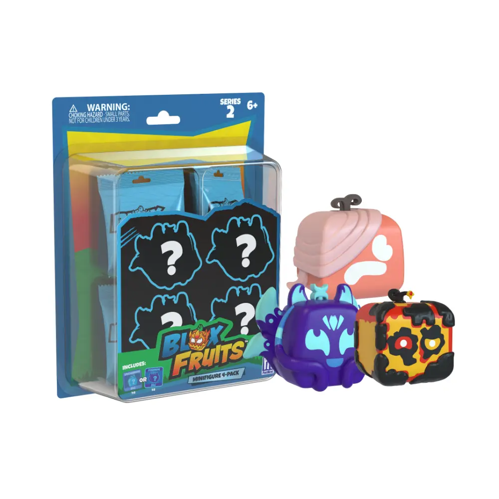Unleash the adventure with the Blox Fruits Minifigure 4-Pack Series 2! Perfect for fans aged 6 and up, this exciting set brings the thrilling world of Blox Fruits to life with a collection of four minifigures. Dive into the unknown and discover which characters youll unbox, each one adding a new layer of fun and excitement to your playtime.From the hit game, comes the Blox Fruits Series 2, Minifigure 4-Pack! Collect all of your favorite, magical fruits, from the explosively fun Bomb, to rare melty Magma, terrifying T-Rex, and legendary Kitsune. Each pack comes with four Magical Mystery Fruits. Series 2 includes ten fruits to collect, so you never know what youï؟½ll get! Remember, with Blox Fruits, you are what you eat!