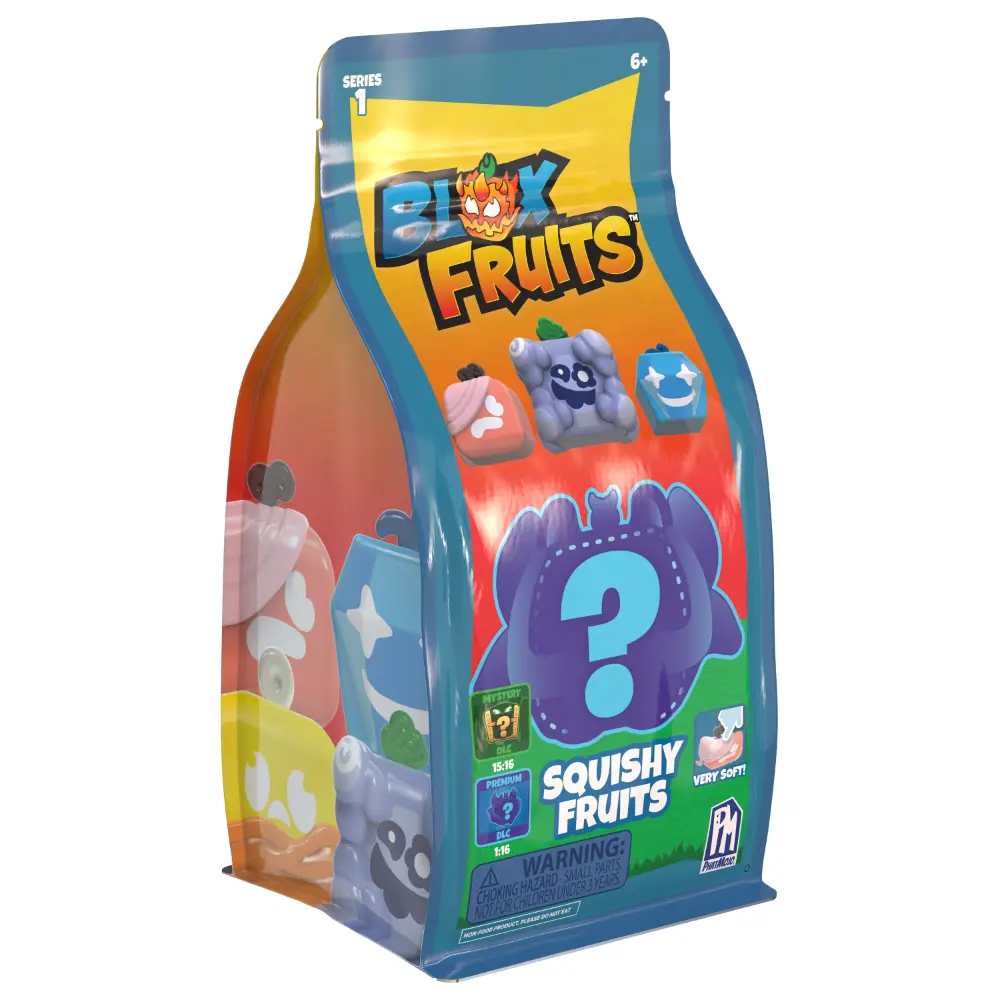 Unbox fruity fun and discover squishy surprises with Blox Fruits Squishy Fruits – Series 1! Inspired by the massively popular Roblox game Blox Fruits, each mystery pack contains a collectible fruit with soft, squeezable textures that are as fun to play with as they are to display. Fans can hunt for Premium Fruits or the ultra-rare Mystery Fruit while enjoying the added excitement of exclusive in-game DLC codes. Perfect for Blox Fruits enthusiasts aged 6 and up, these collectibles bring the adventure from screen to reality in the most squishable way!
