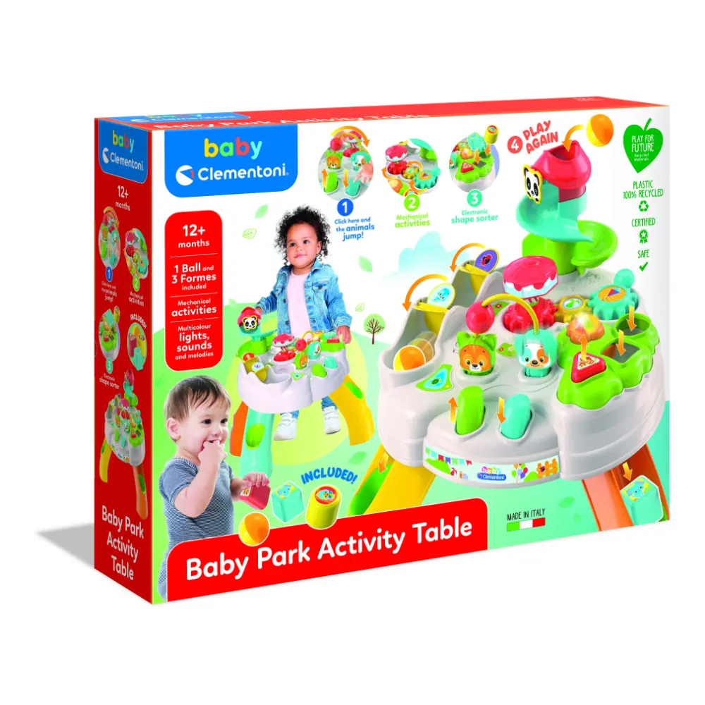 A rich interactive electronic activity table set in the fun world of amusement parks. Contains many activities: the shape area is interactive with lights and sounds, the gears rotate and the characters move when the buttons are pressed. Includes a fun route with balls and slides that ends in the feet of the table. Stimulates manual skills, visual perception and recognition of the cause-effect relationship.