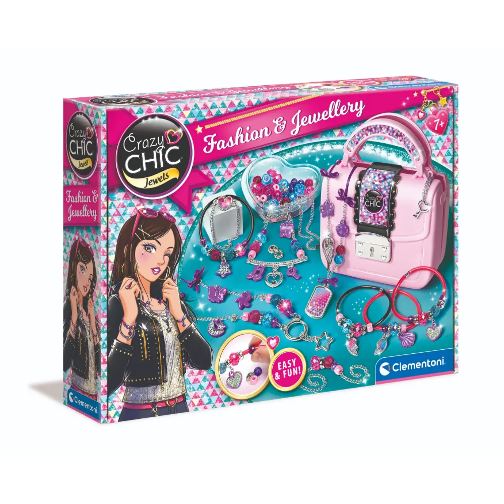 A beautiful and fashionable handbag with metallic clasp containing a romantic chest full of accessories to create super-glam jewellery! An original kit with lots of multifaceted and metallised beads, chains and pendants to customise and make trendy jewellery! The bag is designed to store all the components and creations so you can always carry your jewellery workshop with you!