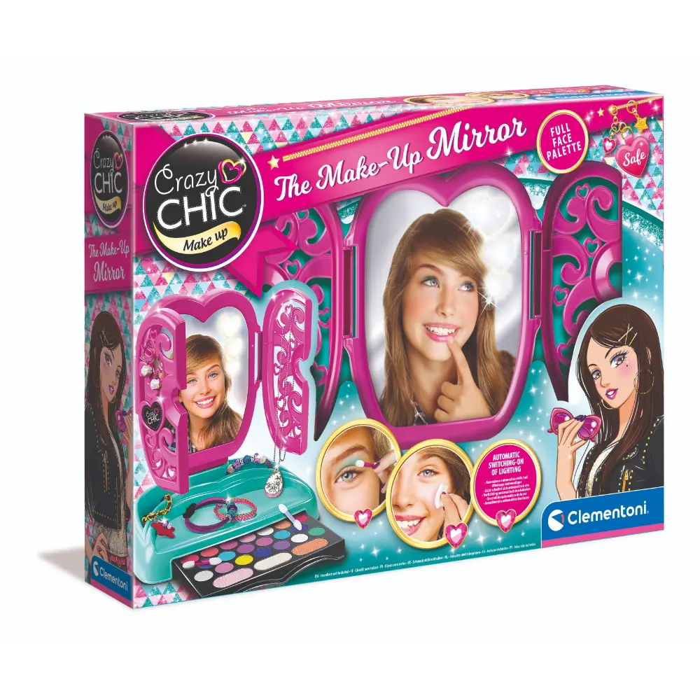 A refined make-up organiser with ï؟½very chicï؟½ modern-style mirror lights, for creating make-up like a real make-up artist. The make-up organiser contains a rich set of cosmetics with lip glosses, eyeshadows and foundation. And to create make-up just like your mum, an applicator and a sponge are also included. The lights switch on when the mirror is opened for creating the right atmosphere and making the moments of play even more pleasant and engaging. The make-up can be easily removed with water and is made with tested non-toxic materials that are totally safe.