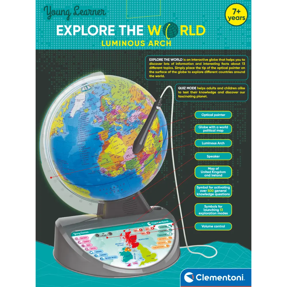 Discover the world in an exciting, interactive way with this beautifully redesigned Talking Interactive World Map featuring an optical reader pen and a light-up transparent arch. Children can explore continents, countries, capital cities, populations, currencies, languages, time differences, and fascinating facts—all through engaging audio and touch-based learning. With over 500 questions across three difficulty levels, kids can test their knowledge while enjoying more than three hours of high-quality audio content, world music, and fun facts. The included app adds an extra layer of discovery: simply frame the map with a tablet or smartphone to reveal animals, monuments, and cultural highlights through augmented reality.