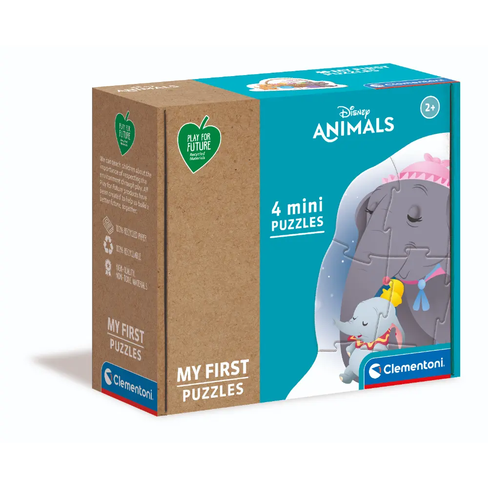 3-6-9-12-piece jigsaw puzzles, four shaped puzzles with increasing levels of difficulty, made using thick and resilient maxi tiles. My First Puzzle is the Clementoni puzzle line designed especially for young children, encouraging them to approach the world of puzzles! A puzzle made of 100% recycled and recyclable materials. PLAY FOR FUTURE puzzles are created with the specific aim of using games to transmit to children the importance of sustainability and environmental friendliness. Artists’ illustrations with characters and themes specifically designed to appeal to children and capture their attention. Puzzles to stimulate your child’s dexterity and imagination. Made in Italy.