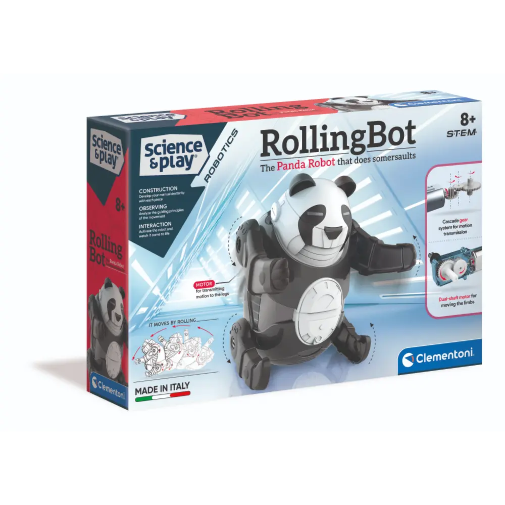 Simply adorable with its funny looks, the panda robot moves by doing somersaults like in real life! An animal robot that can be assembled for an unrivalled play experience. A comprehensive play experience: from the construction stage to direct interaction, a magical adventure in the robotics world. Ideal for developing manual skills, logical abilities and imagination. A robot inspired by the animal world that introduces children to robotics in an original way. The panda performs the somersault while showing the mechanical interaction behind this action. An exclusive and engaging experience that allows the child to interact with the assembled construction, making the game’s progress fun for children and adults alike. Standing nearly 25 cm tall, the robot reproduces the panda’s movement with the amusing clumsiness of this animal. The animal world was chosen to let children observe simple mechanical interactions. The motor allows the panda to do repeated somersaults in a succession of automatic movements. The rotary movement enables it to “bounce” on walls and change direction. During this process, the child is captured by a fun yet engaging play sequence, enabling them to observe how a specific type of motor works. Once it has been built, the panda can be simply placed on its upper limbs and pushed gently to see it roll once, twice, thrice...countless times!