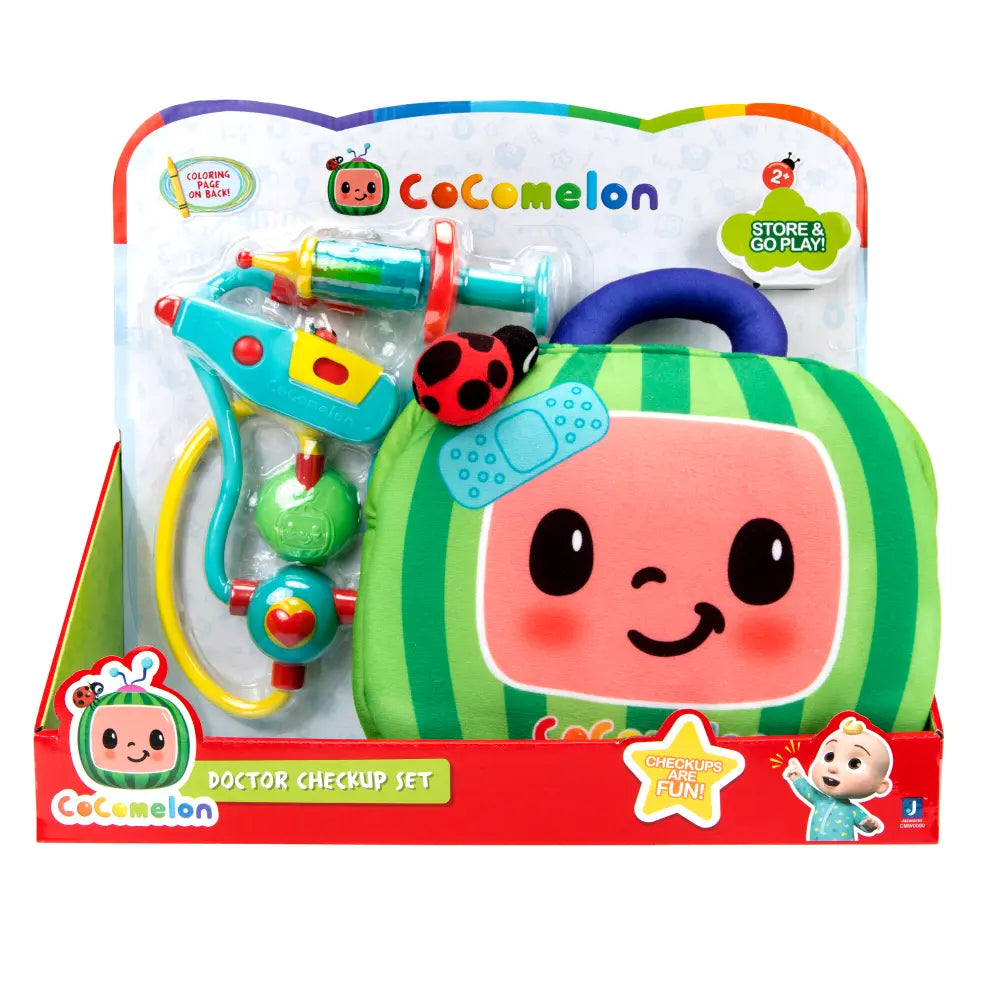 The doctor is IN! Encourage your child�s dream of being a doctor with the CoComelon Checkup Set! This doctor playset for kids is inspired by nursery rhymes from the popular and educational YouTube series, CoComelon! Your child can check your heart with the stethoscope, temperature with the thermometer, and give you a painless shot with the syringe! Your little M.D can slide the thermometer from red to green, and even press the plunger on the syringe down! The medical case features the iconic CoComelon logo, and holds all of your child�s medical tools for on-the-go fun! Bring the CoComelon fun home with the Doctor Checkup Set today!