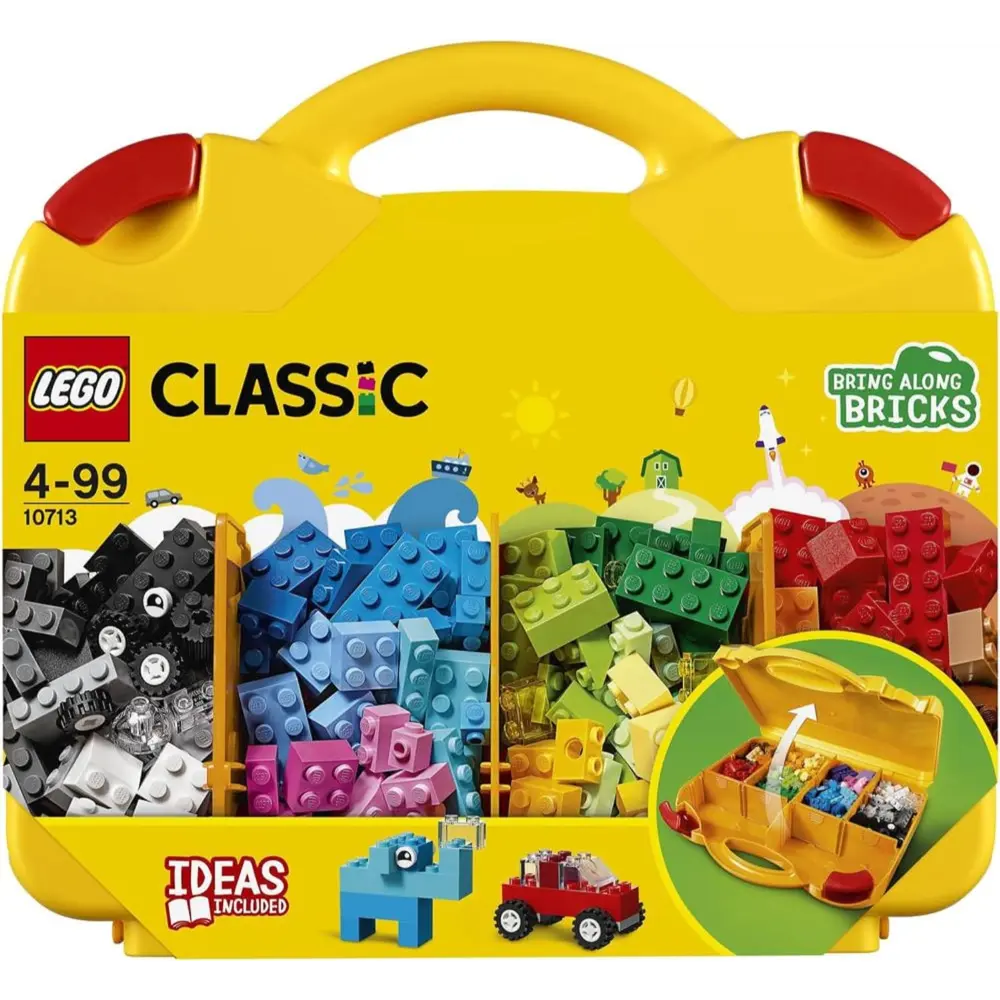 Let your child build anywhere with the LEGO® Classic 10713 Creative Suitcase. This portable set includes a bright selection of LEGO bricks, eyes, wheels and fun shapes for creating houses, vehicles, creatures and more. The sturdy yellow suitcase opens to reveal organized compartments, making it easy to sort pieces and pack everything neatly away. With simple, age-appropriate building instructions included, this set encourages creativity, confidence and endless imaginative play.