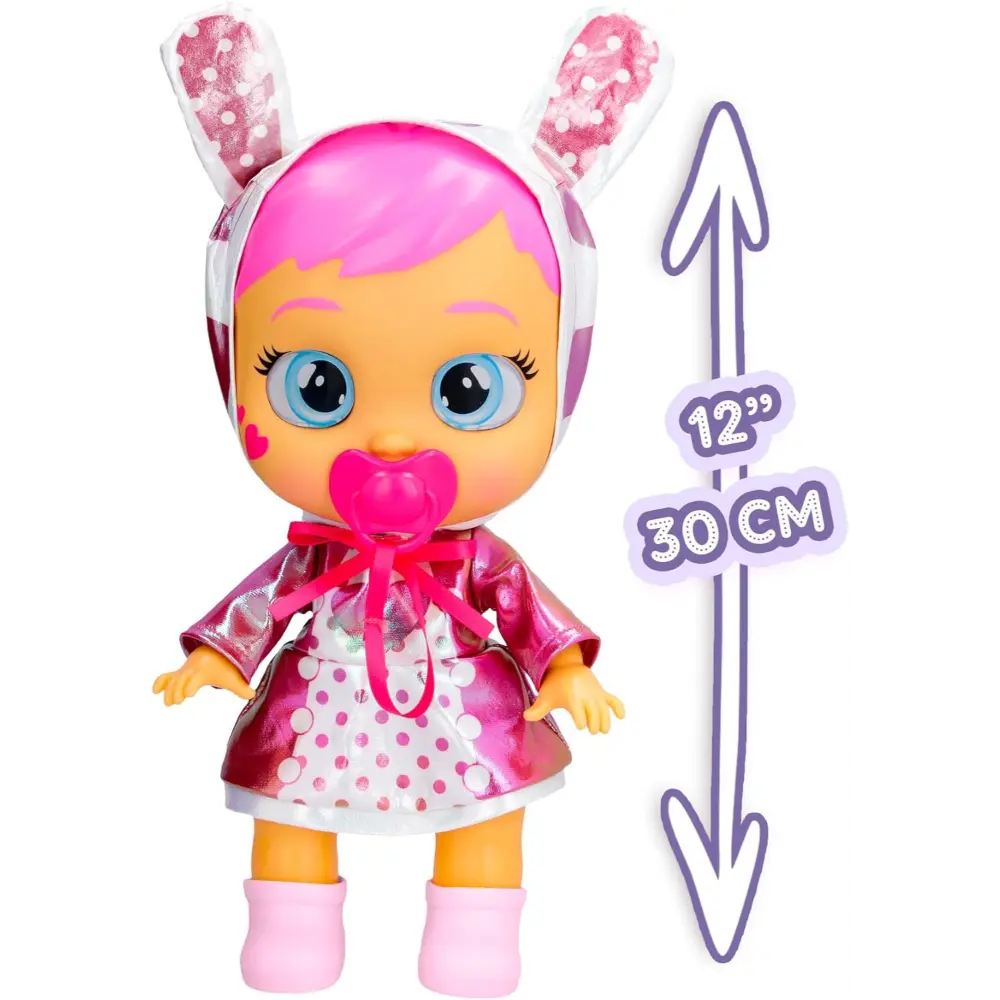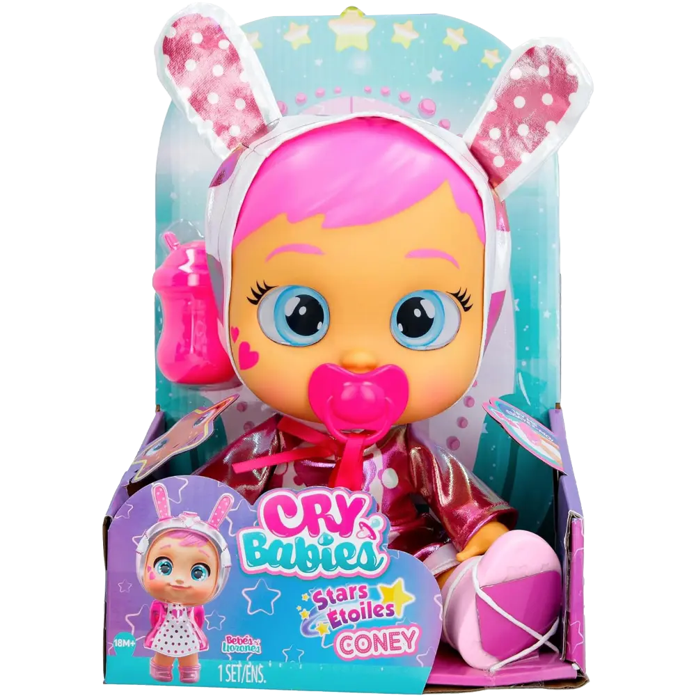 Explore the magical universe of Cry Babies Stars with Coney from Planet Tears! This enchanting doll features shiny, colorful hair and a dazzling space outfit that kids can easily put on and take off. Like all Cry Babies Stars, Coney cries real tears when her pacifier is removed, and her eyes light up with sparkling stars for a magical interactive experience. Soothe her by giving back her pacifier or feeding her beloved baby bottle, and sheβs ready for more cuddles. Coney also plays over 10 realistic baby sounds, encouraging nurturing and imaginative play. The set includes 4 accessories: dazzling outfit, shoes, pacifier, and baby bottle, making her a perfect companion for little ones.