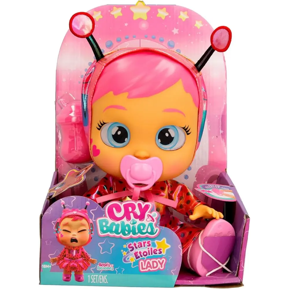 Enter the magical world of Cry Babies Stars and meet Lady from Planet Tears! This enchanting doll features shiny, colorful hair and a dazzling space outfit that kids can easily put on and take off. Lady cries real tears when her pacifier is removed, and her eyes light up with magical stars for a truly interactive experience. Soothe her with her pacifier or beloved baby bottle, and she’s ready for more cuddles. Lady also plays over 10 realistic baby sounds, making playtime even more engaging. With interchangeable clothes, shoes, and 4 included accessories – dazzling outfit, shoes, pacifier, and baby bottle – Lady brings cosmic fun and nurturing play to life.