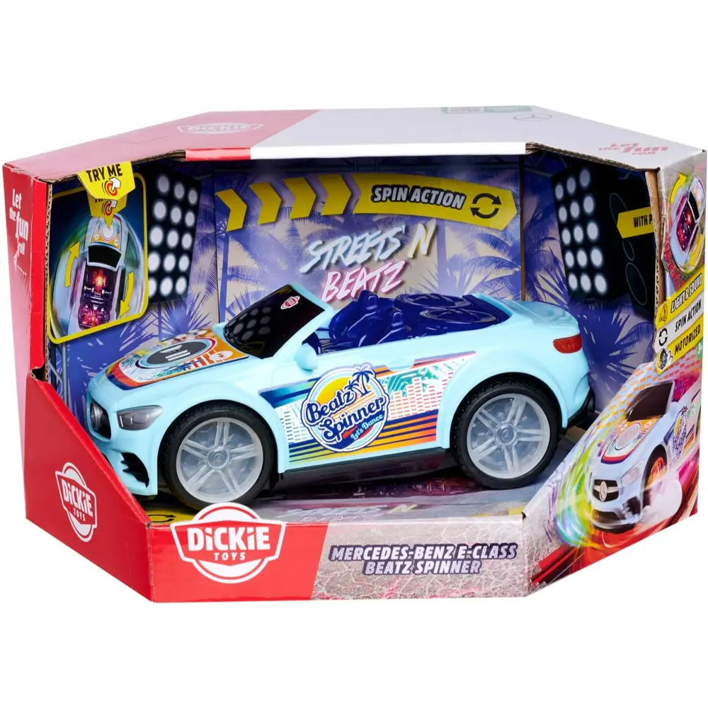Dickie Toys – Mercedes-Benz E-Class Beat Spinner (23.5 cm) – Dancing STREETS N BEATZ toy vehicle, motorized, pop songs and flashing lights, battery-powered, toy vehicle for children aged 3 and above • Self-driving vehicle for children aged 3 and above – This cool Beat Spinner can drive by itself and perform a stunning dance and light show at the touch of a button. • 2 alternating maneuvers – 1. "Bump <(>&<)> Go": The vehicle moves forward and changes direction when it encounters an obstacle; 2.