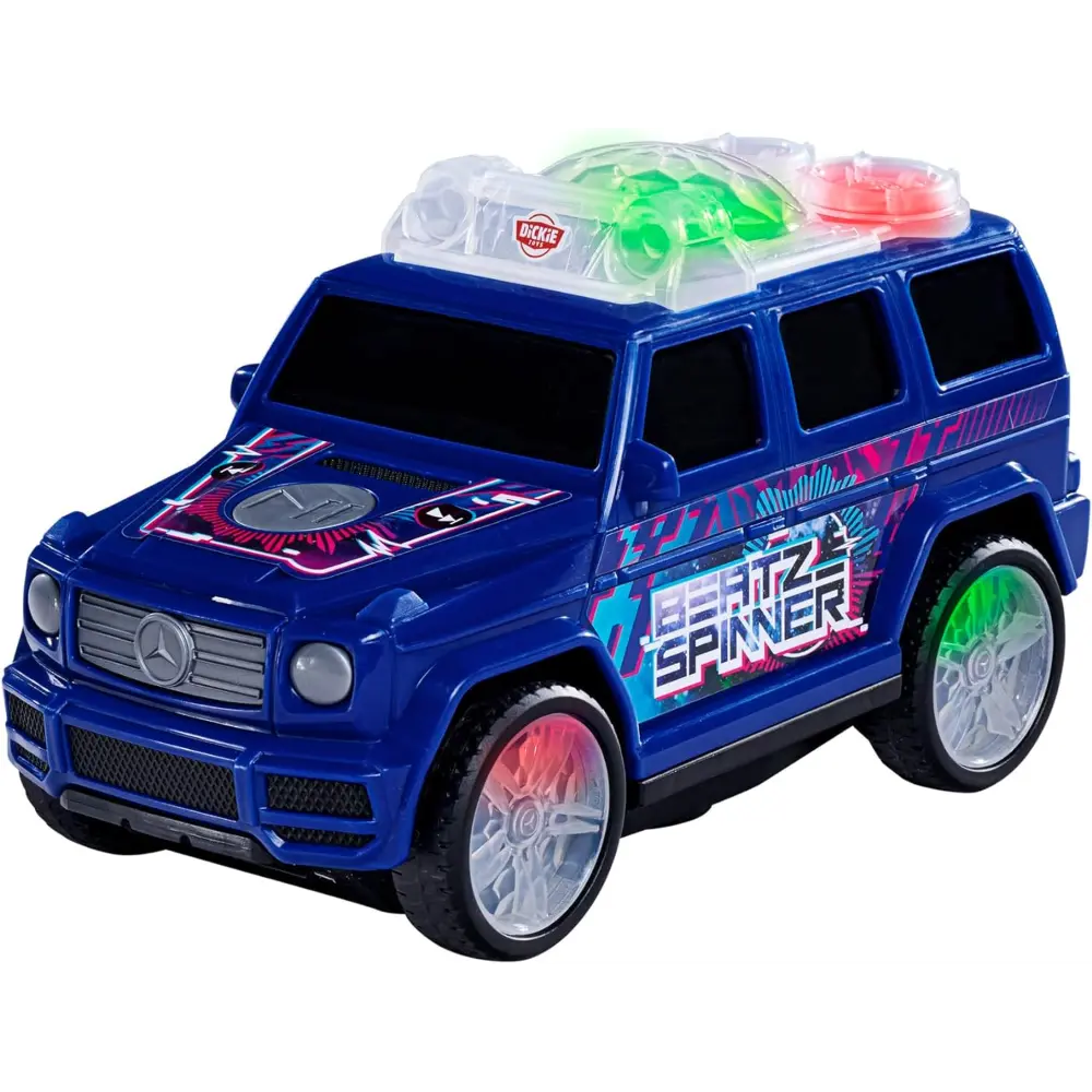 Dickie Toys – Mercedes-Benz G-Class Beat Spinner (23 cm) – Dancing STREETS N BEATZ toy car, motorized, EDM sound and flashing color lights, battery-powered, toy car for children aged 3 and above • Toy car with 2 functions – The Beat Spinner performs two alternating maneuvers: "Bump & Go (the vehicle moves forward and changes direction when it encounters an obstacle) and "Spin" (the vehicle spins rapidly in circles). • Built-in songs and light effects – When you press the button, the self-driving
