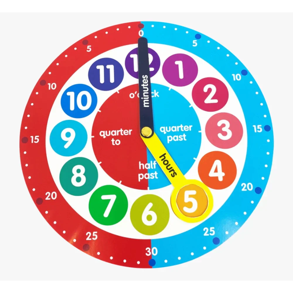 Make learning to tell the time fun with the Early Learning Centre Teaching Clock. This bright and engaging cardboard clock helps children build confidence while exploring hours, minutes, and the concepts of ‘past’ and ‘to’ the hour. Colour-coded halves and labelled hands guide little learners step by step. Start with naming the colours, then move on to counting the numbers, and eventually telling the time. Perfect for hands-on learning and interactive play.