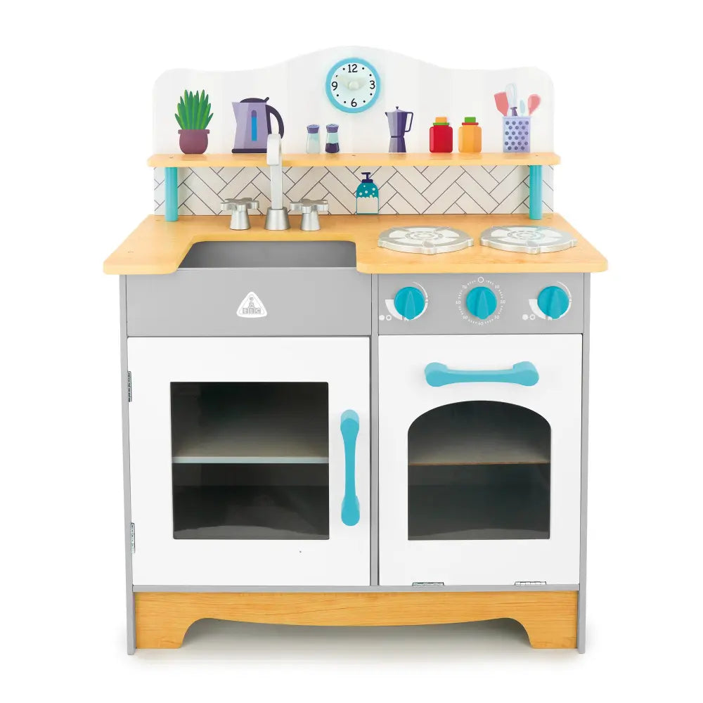 Perfect for little ones who love pretend play, the Early Learning Centre Wooden Classic Kitchen is beautifully crafted for hours of imaginative cooking fun. Children can enjoy preparing tasty treats, placing their creations in the oven, and turning the clicking dials for a realistic cooking experience. They can pop the pots and pans on the stove, check the clock with movable hands, and finish up at the sink with turning taps—just like real grown-ups! This sturdy wooden kitchen encourages creativity, role play, and social skills as little chefs cook up their own delicious adventures.