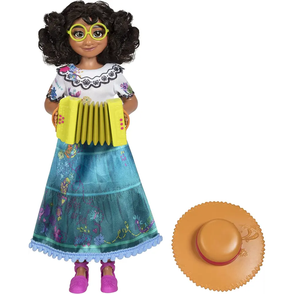 Walt Disney Animation Studio s 60th feature, Encanto, tells the tale of an extraordinary family, the Madrigals, who live hidden in the mountains of Colombia, in a magical house, in a vibrant town, in a wondrous, charmed place called an Encanto. The magic of the Encanto has blessed every child in the family with a unique gift from super strength to the power to heal—every child except one, Mirabel. But when she discovers that the magic surrounding the Encanto is in danger, Mirabel decides that she, the only ordinary Madrigal, might just be her exceptional family’s last hope.Celebrate the magic of Disney’s Encanto with Sing & Play Mirabel! This doll can actually play the accordion with your help, just like she does in the film! Press the lever on the back of the doll to help Mirabel move her arms to “play” her accordion as she sings! Dressed in her signature fashion inspired by the film, Mirabel s outfit includes a beautiful embroidery-styled dress with true-to-film details. She also comes with her signature glasses, espadrille shoes, and hat. With the Sing & Play Mirabel doll, you can play out your favorite scenes from Disney s Encanto and take Mirabel on your own musical adventure!