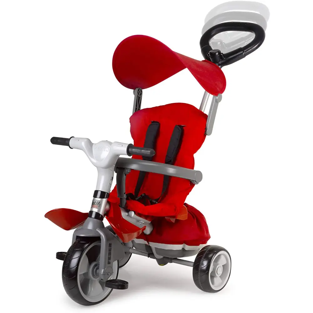 Evolving and steerable tricycle, the most comfortable and equipped of the range.ï؟½Includes musical pack with lights and sounds and replaceable batteries.ï؟½With easy driving system, metal structure for durability, rubber wheels for quieter rides, adjustable handle in 3 positions, a large bag and tipper.ï؟½Includes child footrest, belt, safety bar and hood for added protection.ï؟½In addition, the pedals can be unlocked so they can pedal solo when they grow up.ï؟½For boys and girls from 9 months.