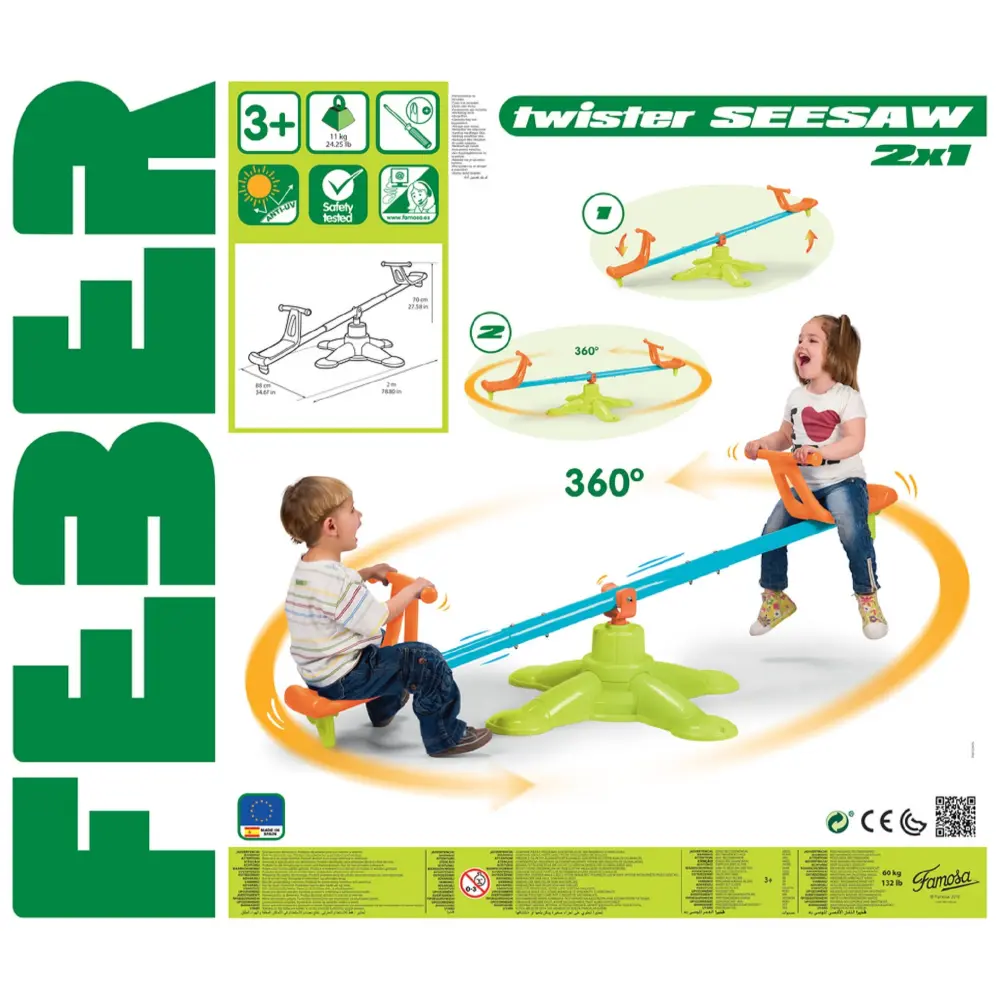 Add fun and excitement to your outdoor play area with the Twister Seesaw 2x1! Designed for durability and safety, this seesaw features a reinforced iron bar that supports up to 200 kg. Its unique design allows a full 360-degree rotation for endless play possibilities. The bright, UV-resistant colors stay vibrant even under sun exposure, and the anti-rust treatment ensures long-lasting performance. Perfect for active play and social interaction, this seesaw is a must-have for children’s outdoor fun.