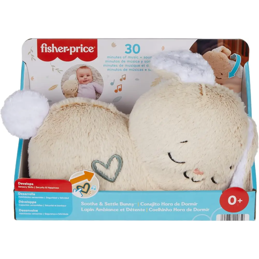 The Fisher-Price Soothe & Settle Bunny Portable Plush Music Box is a soft, cuddly companion designed to comfort and calm your baby. Featuring a rhythmic head nodding motion that mimics breathing and gentle yawns, this plush bunny soothes little ones with movement, sound, and soft light. With five adjustable soothing sounds and a glowing heart light with multiple settings, it adapts perfectly to your baby’s changing needs. A wonderful addition to Fisher-Price’s newborn range, this portable music box helps create a peaceful environment for restful moments anywhere.