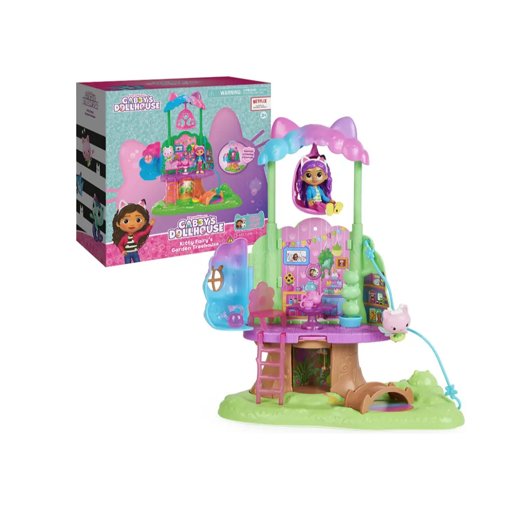 Bring the magic of Gabby’s Dollhouse to life with the Garden Treehouse Playset! Inspired by the enchanted Cotton Candy Tree from the show, this whimsical two-floor treehouse features lights, a transforming canopy, a secret room, vine zipline, swing, and plenty of accessories to spark imaginative play. Kids can explore with Kitty Fairy and an exclusive 3.5-inch Gabby Girl figure, discovering hidden surprises and creating their own dollhouse adventures.