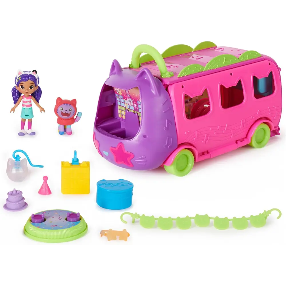 Bring the fun of Gabby’s Dollhouse on the go with the Gabby Girl & DJ Catnip Celebration Party Bus! This exciting party bus features real working wheels and transforms into a full party scene. Pop open the front wall and raise the driver’s cab to reveal a DJ booth, spinning karaoke stage, cat-tastic sofa, dance floor, disco ball, and even a birthday cake for all your friends! Surprise reveals include a pinata with a party hat and a Dollhouse Delivery containing star-shaped party glasses. Additional figures and playsets can be combined for even more imaginative fun.