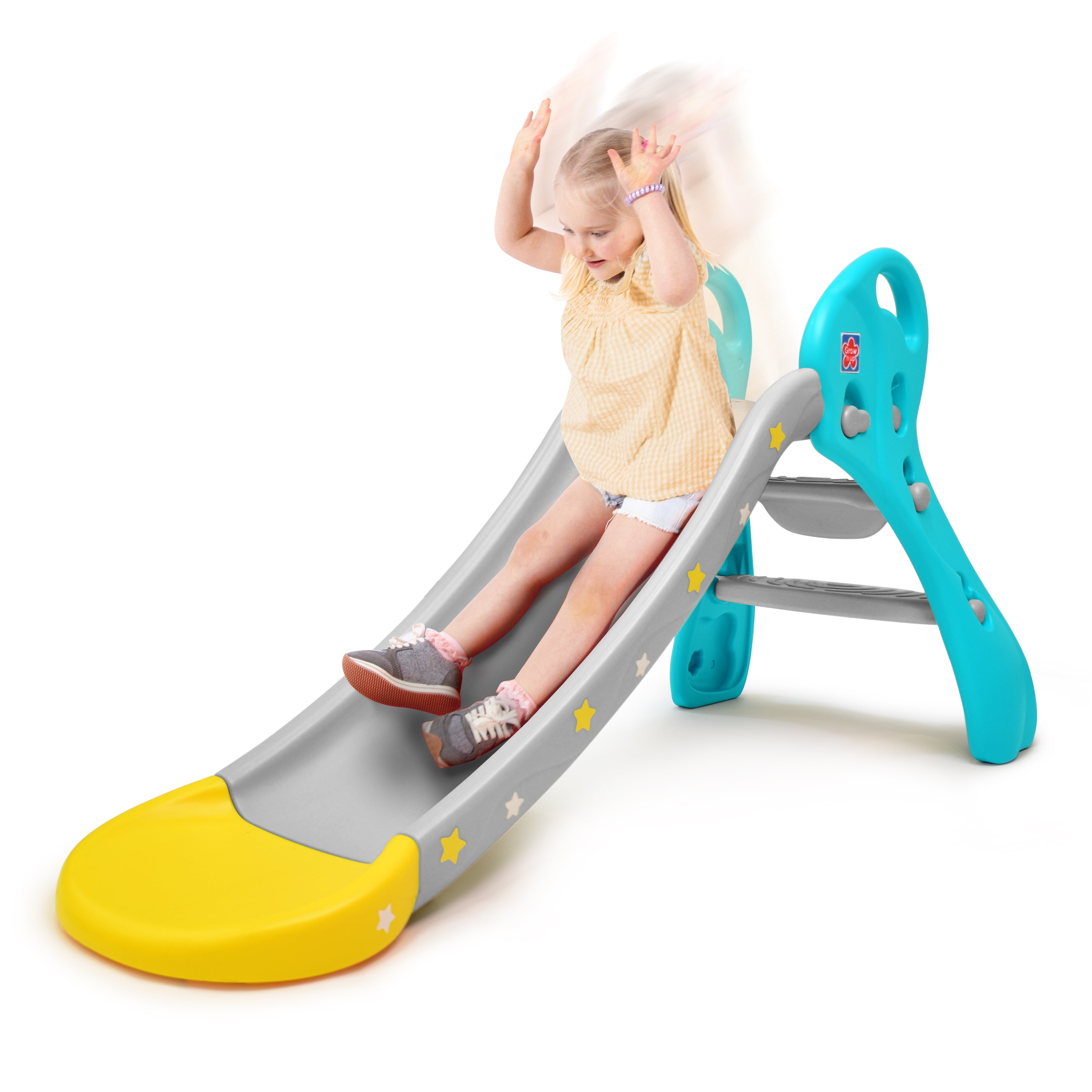 This bright and colorful 2-in-1 slide and basketball playset brings endless fun for children both indoors and outdoors. Quick and easy to assemble, all parts and hardware are included—no complicated tools required. The set features a climbing ladder with handles for safe and easy climbing, a durable slide, and a removable basketball hoop for extra play options. Perfect for backyards, gardens, or indoor play areas, this multifunctional set is designed to last and provide hours of adventure for kids.