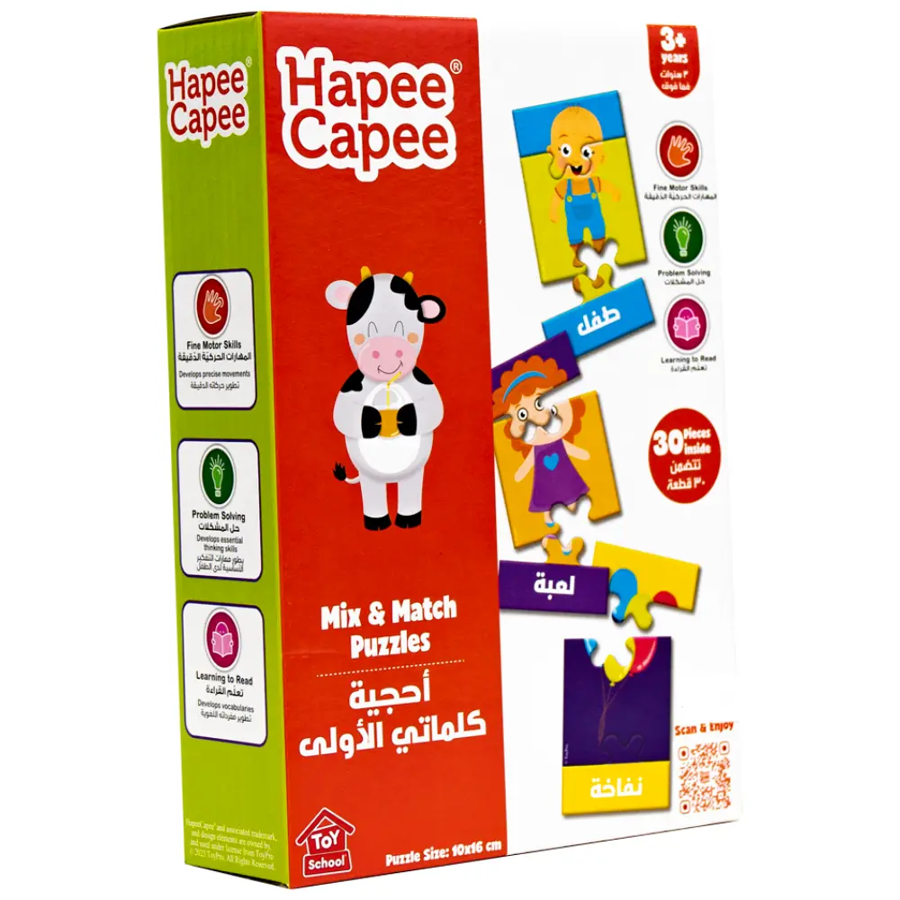 The Hapee Capee 10 Mix & Match Puzzle Arabic is a fun and educational toy designed to develop hand-eye coordination and language skills. Kids can enjoy matching pictures with their related Arabic words, helping to build vocabulary and cognitive abilities while playing. This interactive puzzle encourages early learning in a playful and engaging way, perfect for young learners beginning their Arabic language journey.