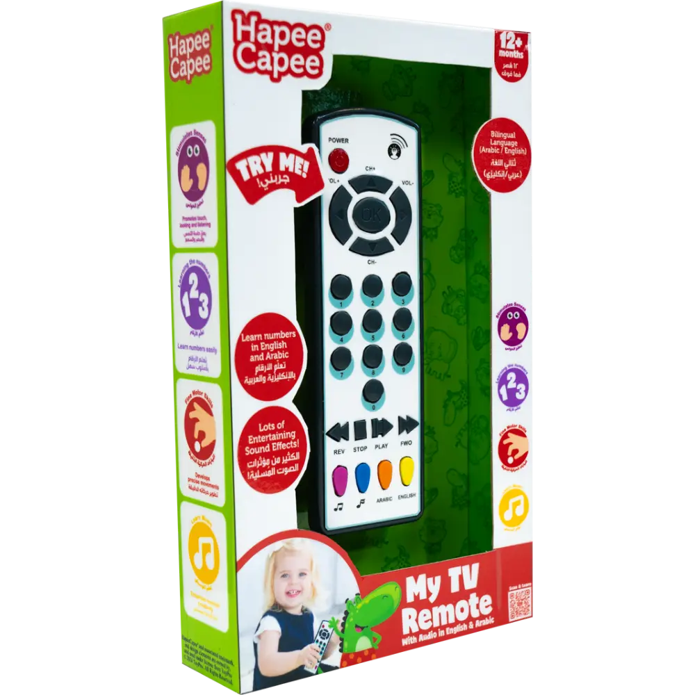 Hapee Capee My TV Remote is an entertaining toy for babys small hand that introduces learning numbers in English and Arabic audio.
