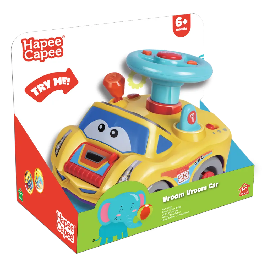 The Hapee Capee Vroom Car is a delightful and interactive toy designed for infants aged six months and above. With its bright colors, friendly face, and engaging features, this fun car helps stimulate sensory development and improve motor skills. Complete with an interactive steering wheel, sound effects, and a key ignition accessory, it encourages imaginative play while enhancing hand-eye coordination for endless playtime fun.
