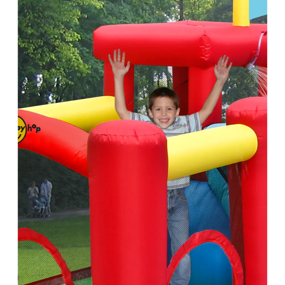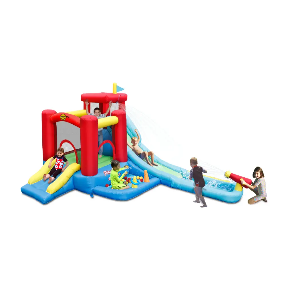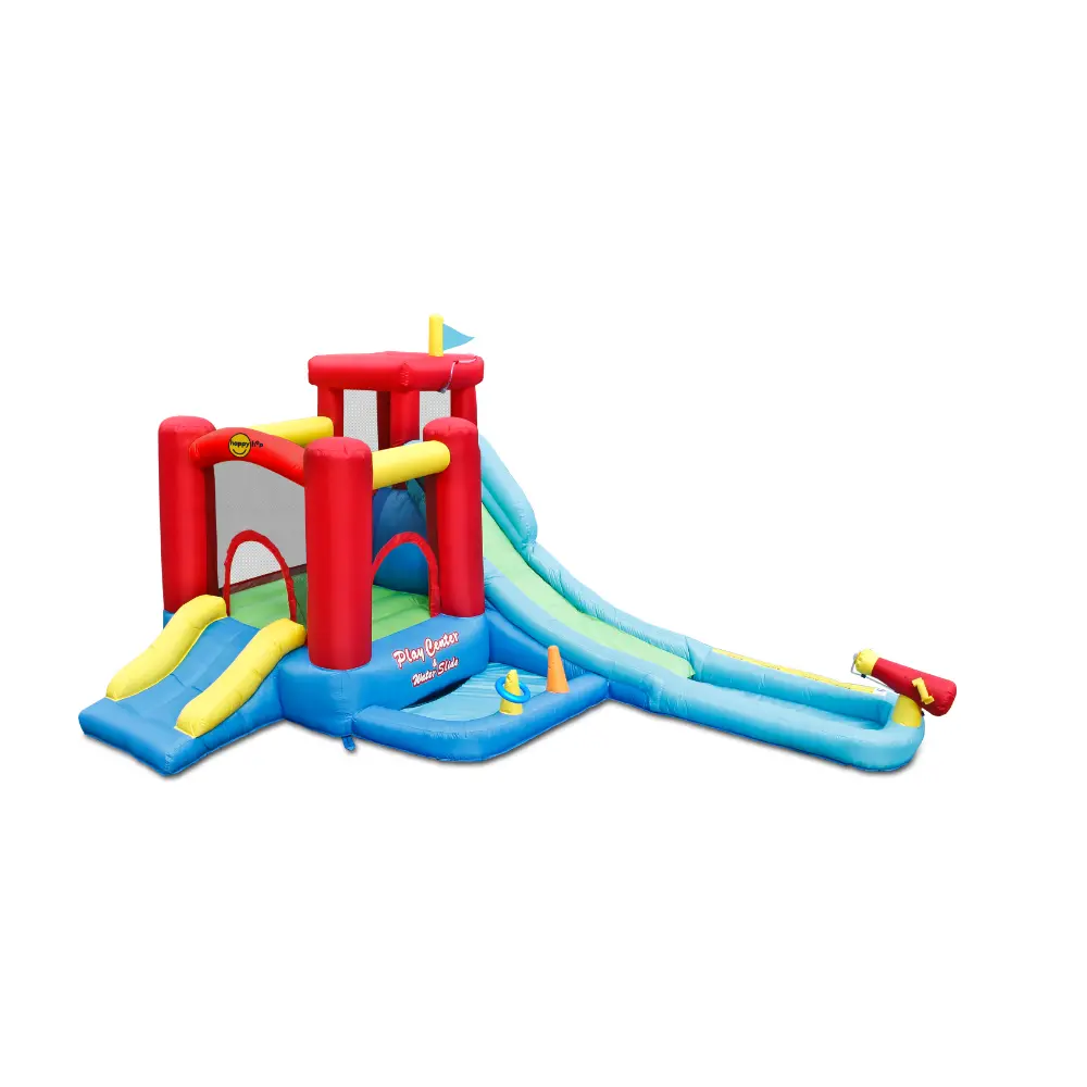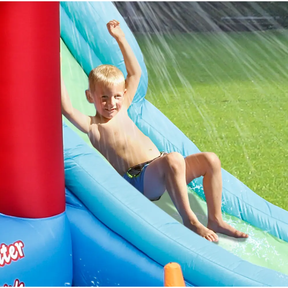 Bring the excitement of an inflatable water park right into your garden with the Happy Hop Play Centre and Water Slide! Simply connect a hosepipe to activate the water cannon and let the splashing fun begin. Kids can climb the wall, slide down the inflatable water slide, and cool off with a big splash before heading over to enjoy a fun ring toss game.