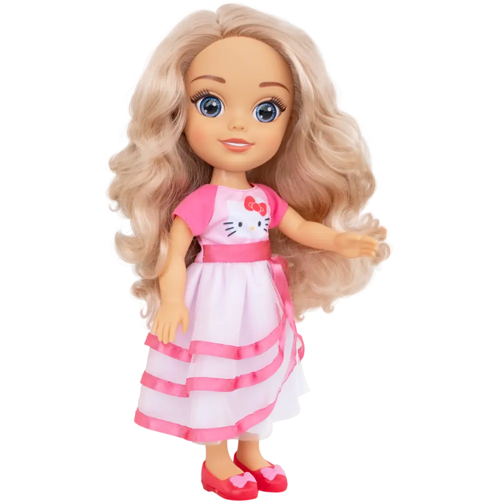 Bring home the joy of celebration with the 14" Hayati Girl Doll in her adorable Hello Kitty Party Dress! Crafted from high-quality, soft, and huggable materials, Hayati is the perfect companion for little ones who love Hello Kitty. Her beautiful, lifelike glass eyes sparkle with charm, while her movable arms and legs allow for playful posing and imaginative adventures. Dressed in a vibrant party dress featuring Hello Kitty’s iconic face and paired with matching shoes, Hayati is ready for parties, playtime, and everyday fun.